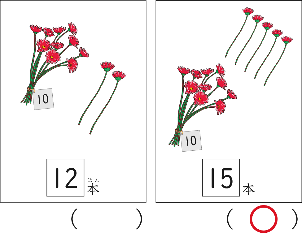 はなのかずをかぞえて おおいほうに〇をつけよう