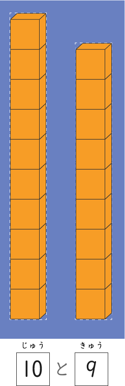 10(じゅう)と 9(きゅう)で 19(じゅうきゅう)だね