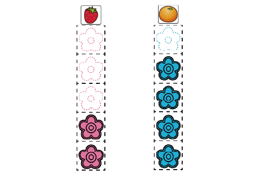 あかのおはじきを いちごの うえに おいてね。あおのおはじきは みかんの うえに おいてね。さいごに おはじきを したからおいて かずをくらべてみましょう。