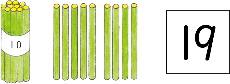 10(じゅう)と 9(きゅう)で 19(じゅうきゅう)だね